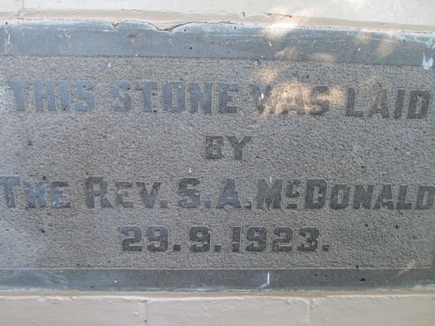 | Foundation Stone Notes: | Foundation stone records: This stone was laid - by - The Rev S A McDonald - 29.9.1923. |